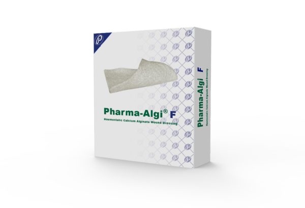 Pharma-Algi F is an absorbent and hemostatic wound dressings, made of alginate nonwoven fibres that form an absorbent pad. In the presence of exudate, the fibers absorb liquid and swell and calcium ions present in the fiber are partially replaced by sodium, causing the dressing to take on a gel-like appearance. This provides a micro-environment that is believed to facilitate wound healing.