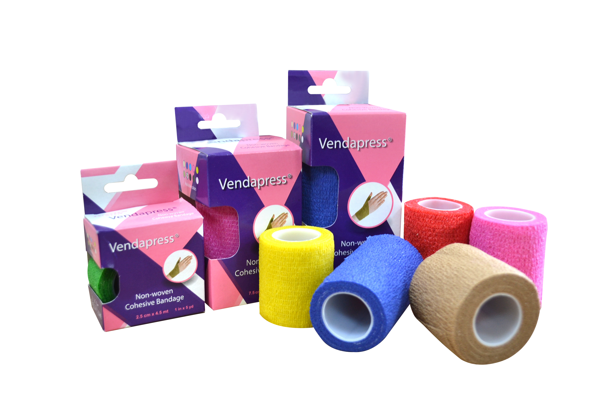 Vendapress Nonwoven Cohesive Bandage is an economical, self-adhering bandage, which has a combination of high strength elastic non-woven cloth and a latex coating which allows cohesive properties.